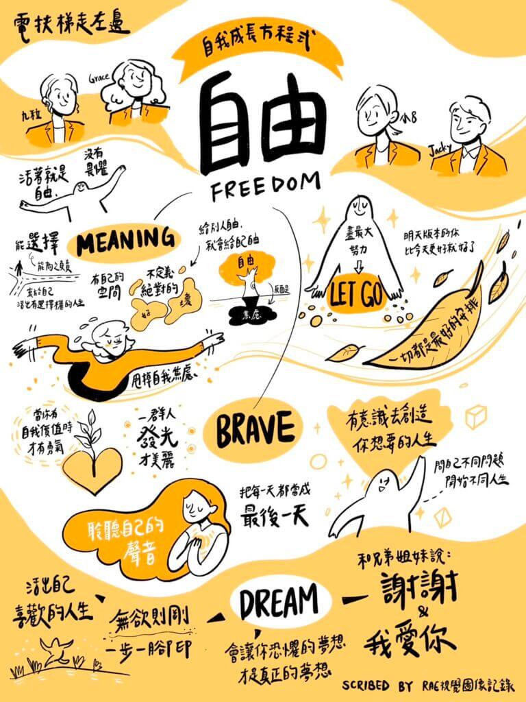 今天整場圍繞著三個主題:自律、自由、自愛。這些詞語聽起來熟悉,甚至有些太常出現在我們的生活中,聽完與會者們的分享收穫了不少對於這些詞彙更立體的見解。