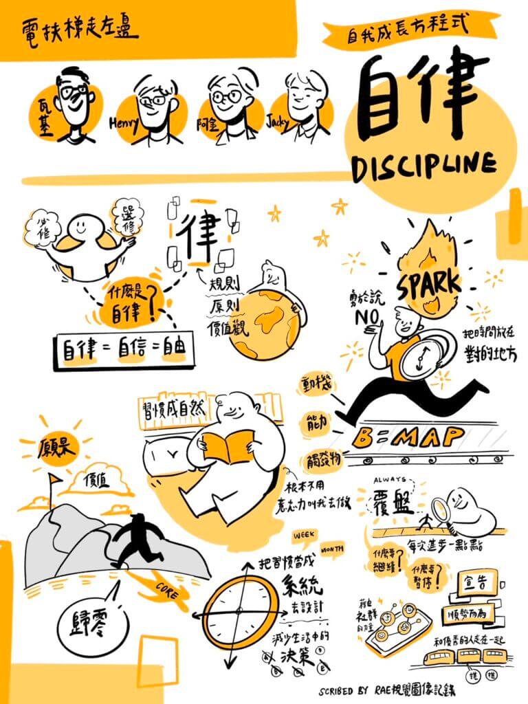我也很認同過程中瓦基分享的,若是強行要在生活中強行達到自律,那樣反而無法自然而然的長期持續,倒不如從身邊的習慣開始逐步養成,且不一定要對外公告與大張旗鼓,可以先從降低摩擦力的那些習慣開始。